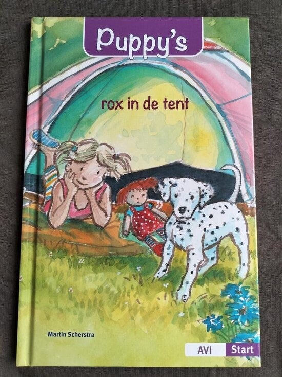 Tes is in haar tent. Ze is moe. Slaap je al, rox? Woef! doet de pup.